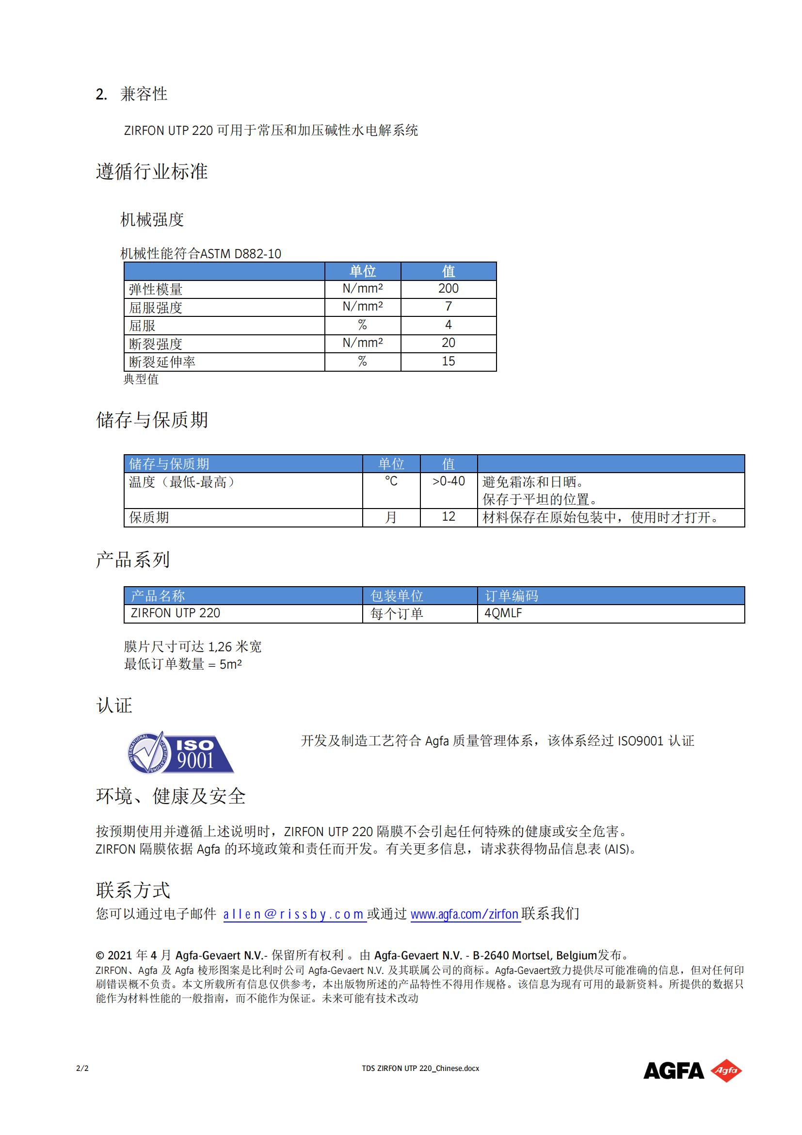2021 年 5 月 5 日,AGFA推出用于生產(chǎn)綠色氫氣的高性能 ZIRFON UTP 220 膜。